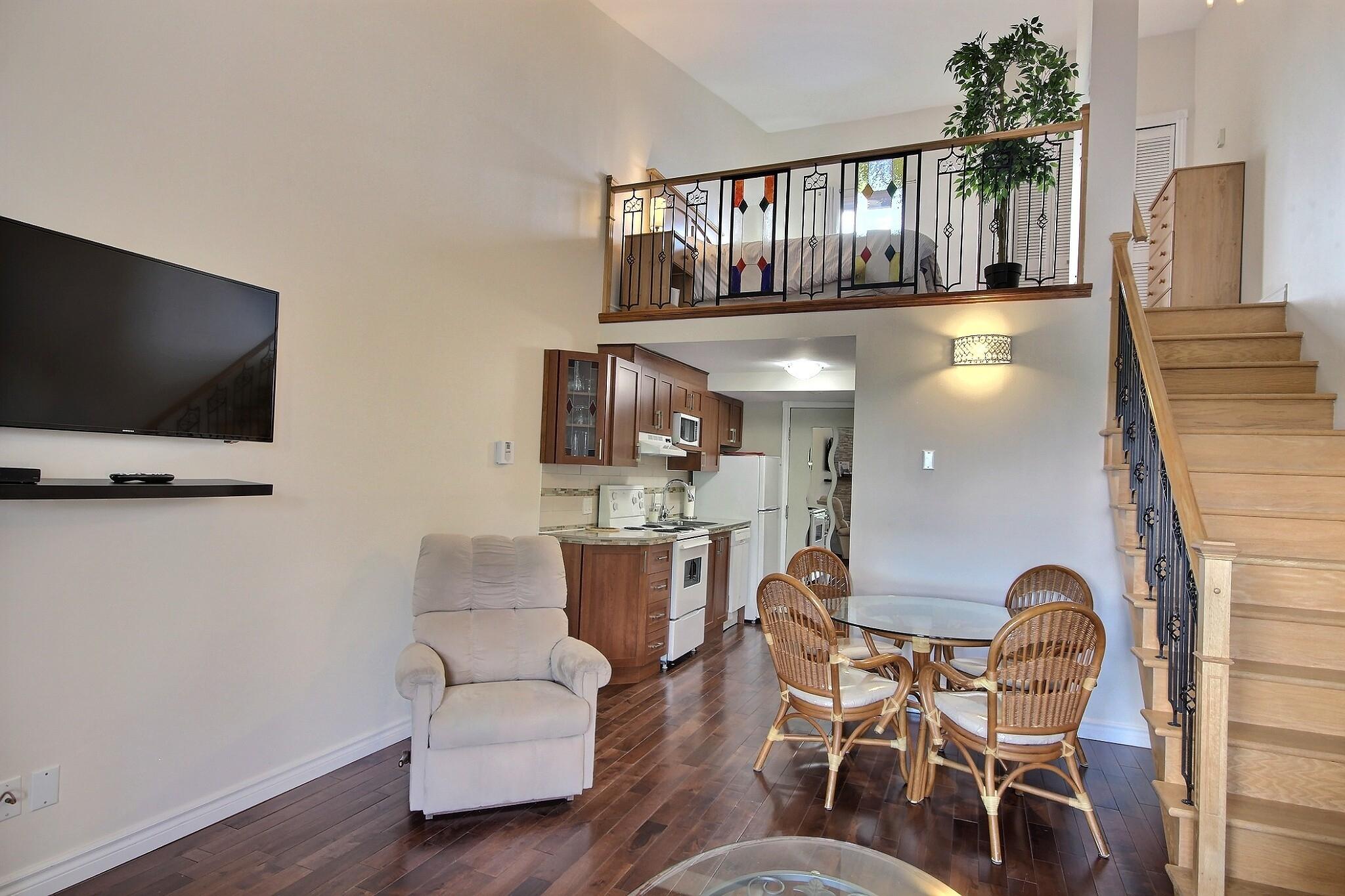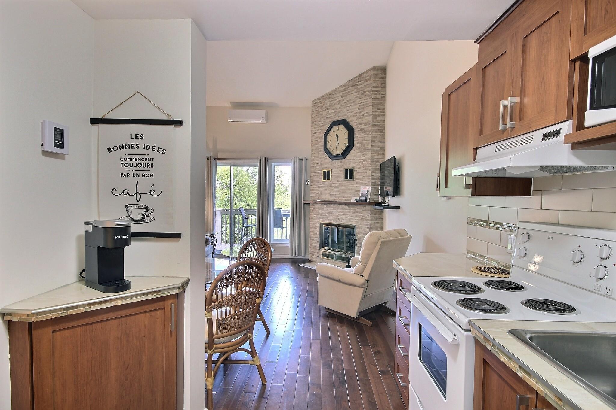 Entièrement meublé avec cuisine et salle de bain offrant tout le nécessaire dont vous aurez besoin (micro-onde, lave-vaisselle, cafetière Keurig et cafetière avec filtre, grille-pain et comprenant tous les accessoires de cuisine.TV HD avec câble, Internet, Wi-fi, jeux de société, foyer au bois (bûches écologiques seulement$), air climatisé. Lit queen en chambre mezzanine, divan-lit (double) au salon, literie, serviettes de bain (sauf serviettes de plage/piscine)Condo et édifice non-fumeur, animaux interdits, immeuble tranquille, pas de bruit entre 23h et 8h, stationnement en bas du condo et balcon privé avec mobilier de patio. Buanderie sur place$, piscine intérieure (eau salée) avec spa, piscine extérieure (eau salée), sauna, salle de gym, petite plage, chaises longues et balançoires, modules de jeux pour enfants, terrain de volley-ball, pétanque, support à vélo, marquise avec chauffe-terrasse, frigo et BBQ. Possibilités de louer des motos marines $ ou des bateaux $ dans les marinas à proximité. Possibilités de louer un quai $ et un espace de stationnement à la Marina à 3 minutes de marche ou au Quai municipal. (Les remorques à bateaux sont interdites dans le stationnement et sur la rue Théroux ).